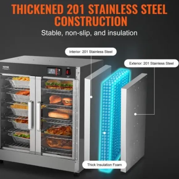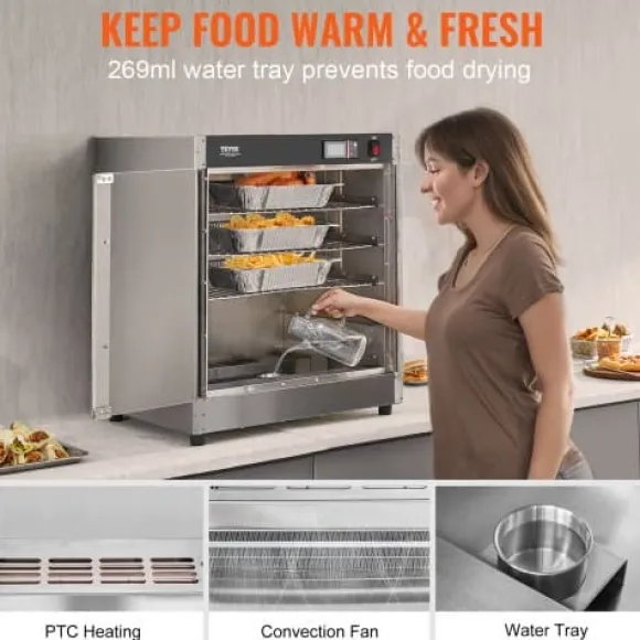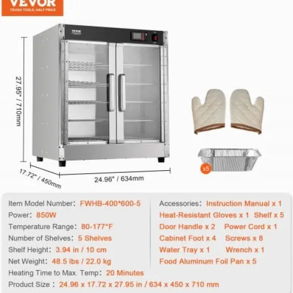 Denna 5-vånings värmeskåp för mat är utformad för att hålla en mängd olika rätter varma och fräscha under längre perioder, vilket gör den idealisk för restauranger, matsalar och kiosker. Med justerbar temperaturkontroll, jämn värmefördelning och en rymlig, hållbar konstruktion i rostfritt stål säkerställer den att maten behåller sin smak och konsistens. Skåpet har lättstädade ytor och flexibla hyllor för att rymma olika typer och storlekar av mat.