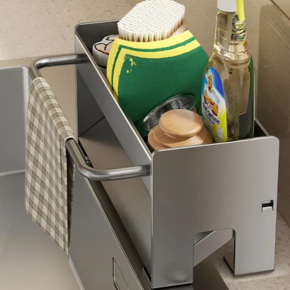 Den här smidiga vaskhållaren kombinerar funktionalitet och design för att hålla ordning på diskborstar, trasor och andra köksredskap. Med en storlek på 23,2 x 9 x 10,3 cm och tillverkad i robust kolfiberstål är den både praktisk och estetisk. Den lutande designen med automatisk dränering håller dina redskap torra och din köksbänk fri från vattenfläckar.