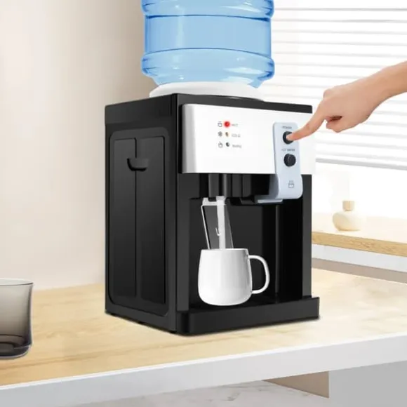 Elegant vit bords-vattenautomat med innerbehållare i 304 rostfritt stål – hygienisk, snabb varm/kall och smidig enhandsanvändning för hem och kontor.