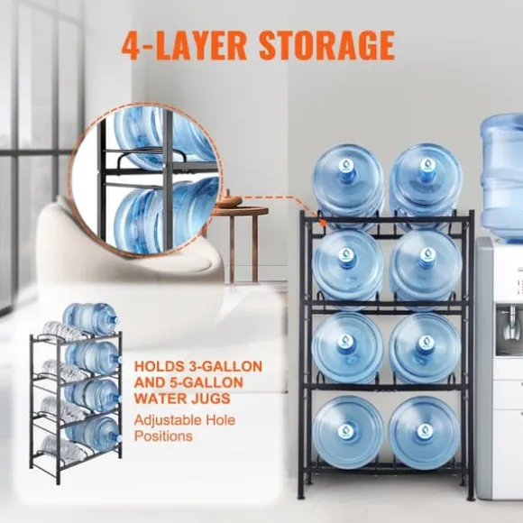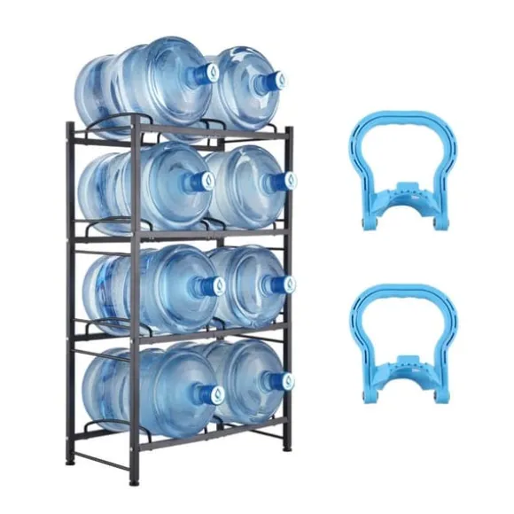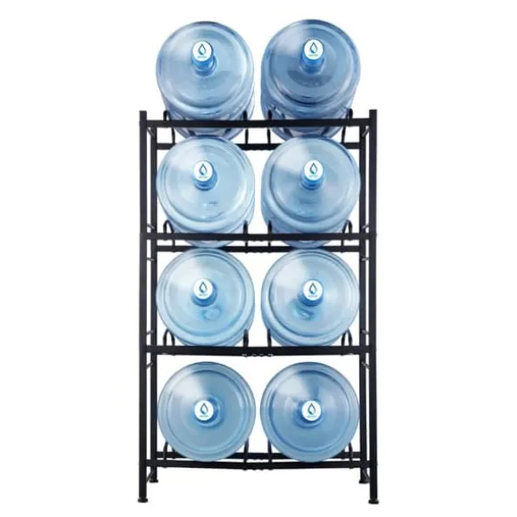Vattengallonhållaren har höga skyddsräcken för att förhindra att högre hinkar faller, hyllspår för att hålla flaskorna säkra och justerbara fötter för att skydda golv och stabilisera ställningen på ojämna ytor. Handtag gör det enkelt att placera flaskor.