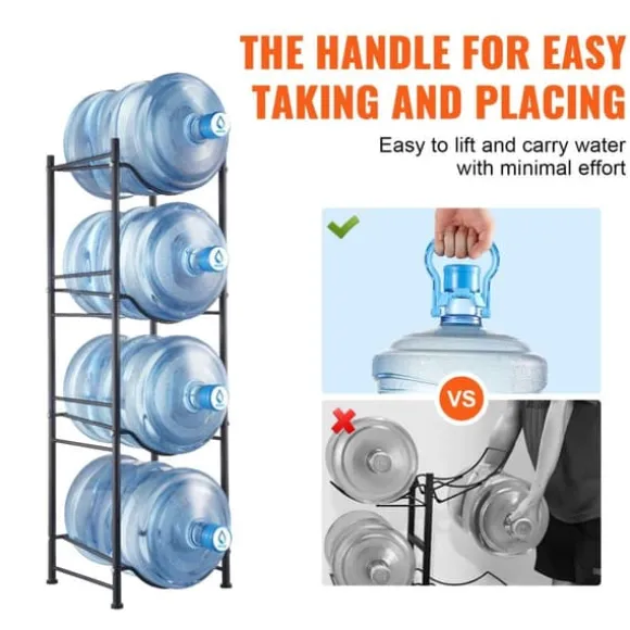 Vår vattenkannahållare har höga skyddsräcken för att förhindra att högre hinkar faller och hyllspår för att hålla flaskorna säkert på plats. De fyra justerbara fötterna skyddar golv från repor och säkerställer stabilitet på ojämna ytor. En tippskyddsfunktion gör att ställningen kan monteras på väggen för extra stabilitet. Handtag gör det enklare och bekvämare att lyfta och placera flaskor.
