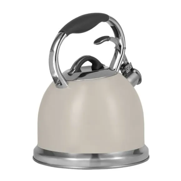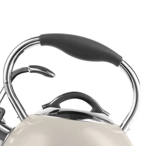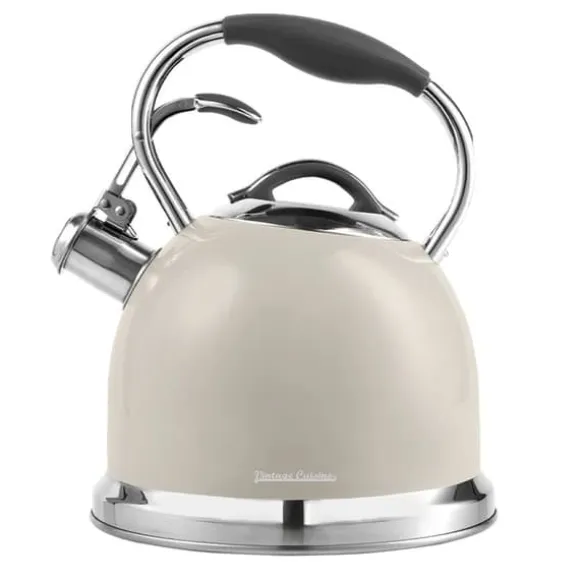 Ett länge efterlängtat tillskott till Vintage Cuisine-kollektionen: en visslande vattenkokare för traditionell dryckesberedning. Lämplig för alla typer av spishällar: keramik, induktion, gas, halogen och elektrisk. Tillverkad av rostfritt stål 304, med dubbel botten som garanterar jämn och snabb uppvärmning. Tack vare den höga visslingen kommer du definitivt aldrig att glömma att förbereda en planerad dryck. En vattenkokare är ett måste i köket. Därför är det värt att se till att vattenkokaren uppfyller dina förväntningar, såsom tillräcklig vattenkapacitet – så att en engångsanvändning räcker för att förbereda en varm dryck för varje hushållsmedlem eller gäst – och kraft som gör att du snabbt kan koka vatten – särskilt när du kommer hem iskall på vintern! Utseende är naturligtvis viktigare än funktionalitet, så vi har säkerställt en unik design som gör denna retro-vattenkokare till ett elegant tillskott till ditt kök. Finns i fyra färger: creme, mint, röd och svart. 2,4 liters kapacitet. Tack vare vattenkokarens stora kapacitet kan du förbereda en varm dryck för 9 eller fler personer åt gången. Det avtagbara locket möjliggör bekväm hällning. Lämplig för alla typer av spisar. Föredrar du den traditionella tillagningen av varma drycker? Vår vattenkokare passar alla typer av spisar: gas, induktion, keramik och halogen. Jämn uppvärmning. Den tjocka dubbla botten fördelar värmen jämnt, vilket resulterar i snabb och ekonomisk uppvärmning.