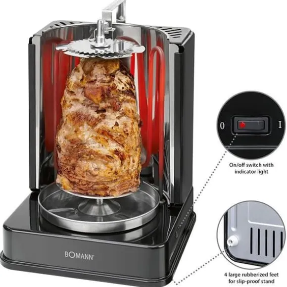 Bomann DVG 3006 CB Black vertikalt spett är en multigrill för fettfri grillning av kycklingar, kebab/gyros eller köttspett. Tack vare det vertikala läget rinner den utströmmande såsen direkt in i fettuppsamlingsbrickan i rostfritt stål.
