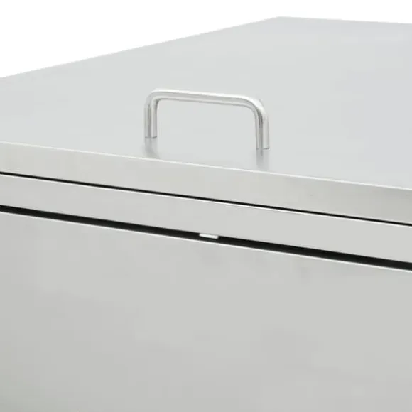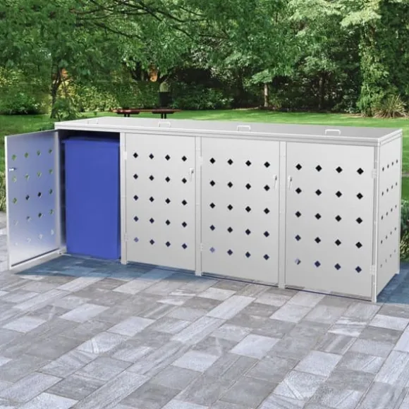 Skjulet för sopkärl är tillverkat av rostfritt stål och är ytterst väderbeständigt och hållbart. De praktiska ventilationshålen möjliggör luftcirkulation och förhindrar otrevliga lukter i skjulet, medan låssystemet gör att soporna förvaras säkert. Dessutom låter den praktiska dörren dig att enkelt sätta in och ta ut sopkärlet.