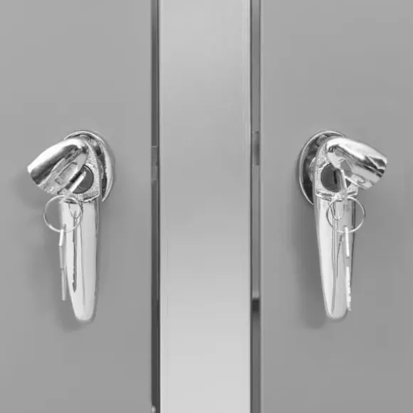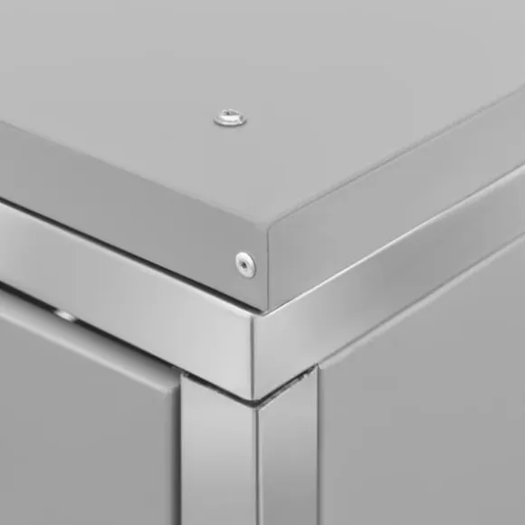 Sopskjulet är tillverkat av galvaniserade stålpaneler och en ram av rostfritt stål, vilket gör det mycket robust och rostbeständigt. Den ihåliga designen släpper in luft och förhindrar otrevliga lukter, medan låset säkerställer säker förvaring av soporna. Dessutom gör det praktiska locket och fjädrarna det enkelt att ta ut och sätta in sopkärlet.