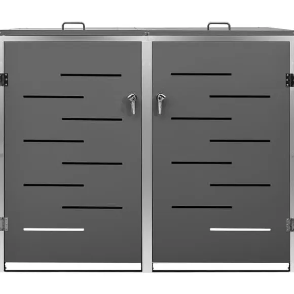 Sopskjulet är tillverkat av galvaniserade stålpaneler och en ram av rostfritt stål, vilket gör det mycket robust och rostbeständigt. Den ihåliga designen släpper in luft och förhindrar otrevliga lukter, medan låset säkerställer säker förvaring av soporna. Dessutom gör det praktiska locket och fjädrarna det enkelt att ta ut och sätta in sopkärlet.