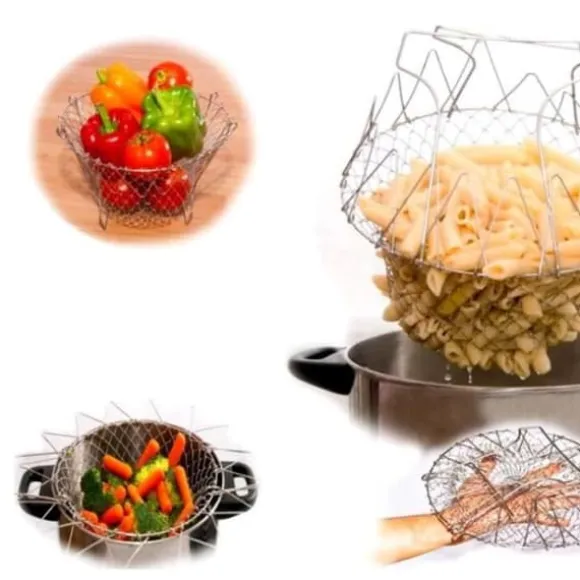 Denna hopfällbara salladskorg i rostfritt stål är hållbar och rostbeständig. Idealisk för att skölja, rinna av eller ångkoka dina grönsaker och pommes frites. Praktisk och lätt att förvara, den är perfekt för förvaring av frukt och snacks. Säljs i set om 2, den kombinerar funktionalitet och kvalitet.