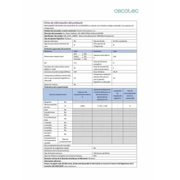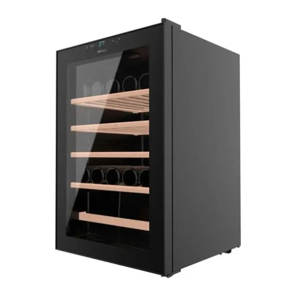 Vinoteket Bolero GrandSommelier 4850 från Cecotec är en fristående enhet designad för att bevara och lagra vin med höga krav på temperatur och utrymme. Med en total kapacitet på 125 liter som rymmer upp till 49 flaskor, kombinerar detta vinotek funktionalitet och bekvämlighet för användare som behöver ett rymligt och organiserat förvaringsutrymme. Utrustad med ett kompressorkylningssystem garanterar det effektiv och konstant kylning, med möjlighet att justera temperaturen mellan 4 och 18 grader Celsius beroende på vintyp, från röda till vita eller roséviner, anpassat efter druvsort och årgång. Dess design har en svart finish, och tillsammans med den enda dörren och det inre LED-belysta utrymmet underlättas visning och åtkomst till flaskorna utan att påverka den termiska stabiliteten. Vinoteket har en intuitiv touchpanel med digital display som alltid visar den interna temperaturen, vilket förenklar inställning av parametrar och styrning av inre belysning. Dessutom gör den tysta driften med en ljudnivå på endast 42 dB den lämplig för vardagsrum, matsalar eller andra rum utan störande ljud. Modellen har energiklass G, vanligt för vinotek med kompressor, vilket innebär kontrollerad energiförbrukning i förhållande till kapacitet och prestanda. Tillverkad i Spanien, erbjuder den en praktisk och estetisk lösning för att bevara vin under optimala förhållanden, vilket skyddar aromer och egenskaper fram till konsumtion. Sammanfattningsvis är Bolero GrandSommelier 4850 ett pålitligt och mångsidigt vinotek som möter lagrings- och bevarandebehov för både vinentusiaster och experter.