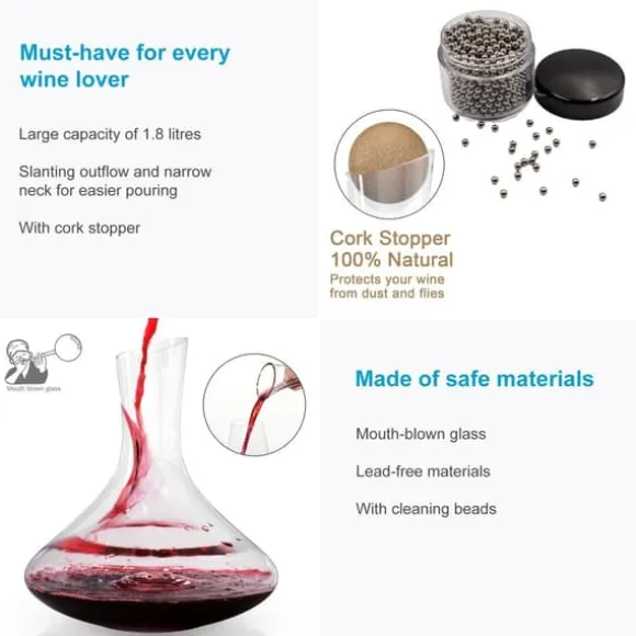 Med en kapacitet på 1800 ml har vinkaraffen den perfekta dekanteringskapaciteten för ditt 750 ml vin. Karaffen levereras med rengöringspärlor i rostfritt stål för att göra rengöringen av ditt glaskärl så enkel som möjligt.