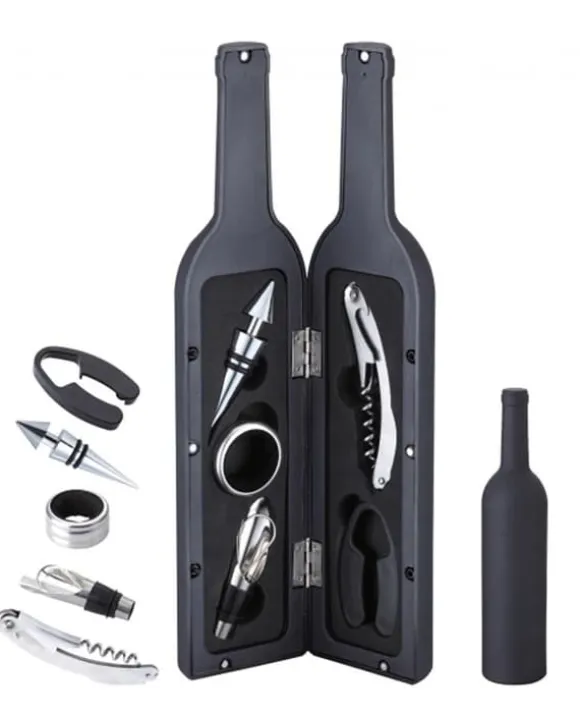 En uppsättning vinredskap i ett fodral i form av en hopfällbar flaska. Setet innehåller: – korkskruv – kniv för att ta bort plastkorkskyddet – stålkork – anti-dropp flaskring – hällare – hopfällbar flaska 32 x 7 cm