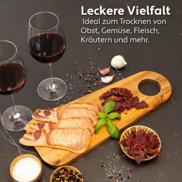 Vita5 livsmedelstork med 7 plattor i rostfritt stål gör det möjligt att torka frukter, grönsaker och kött. Med en värmekontroll från 35 till 75 °C och en elektronisk timer garanterar den optimal bevarande av näringsämnen. Lätt att rengöra, plattorna är avtagbara och kan diskas i diskmaskin. Perfekt för hälsosamma snacks och för att minska matsvinn.