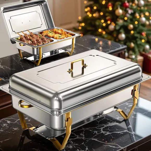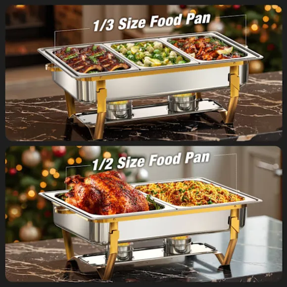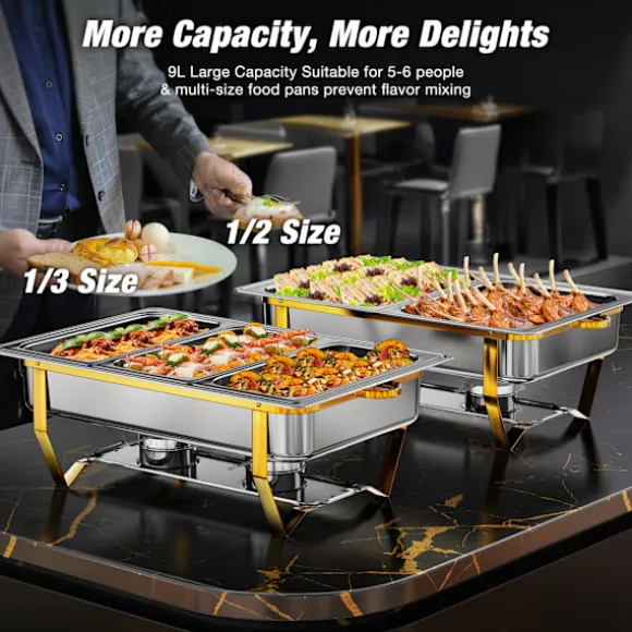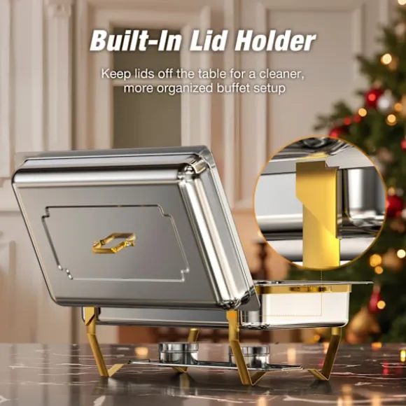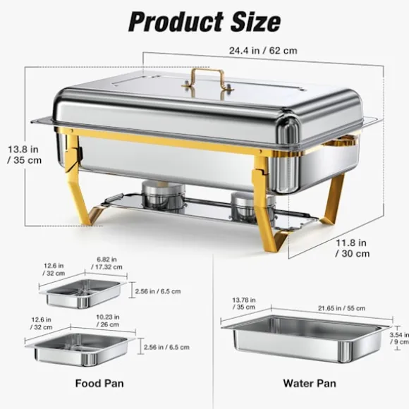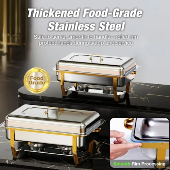 Varmhållningsfat-buffésetet är tillverkat av kraftigt, livsmedelsklassat rostfritt stål som motstår rost, bucklor och slitage för långvarig användning. De rullade kanterna på varmhållningsskålarna i rostfritt stål erbjuder säker hantering och hjälper till att förhindra oavsiktliga skärskador under uppställning eller servering.