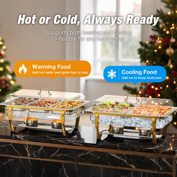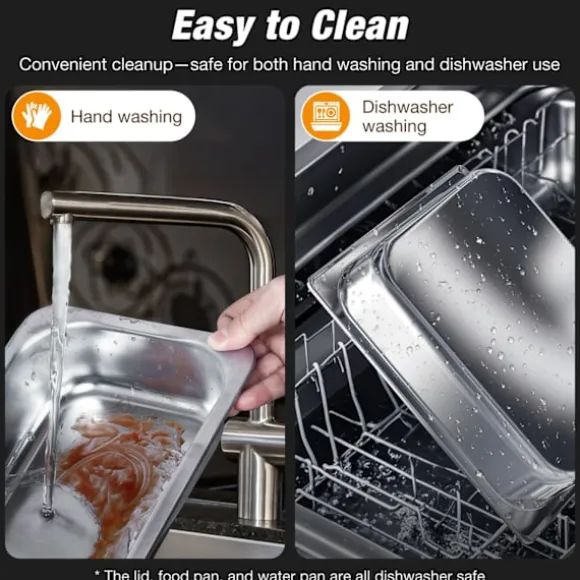 Den spegelblanka ytan i rostfritt stål på de guldfärgade varmhållningsskålarna och buffévärmarseten motstår mat som fastnar och är lätta att torka av. Spara tid efter evenemang – diska bara eller diska i diskmaskinen för enkelt underhåll
