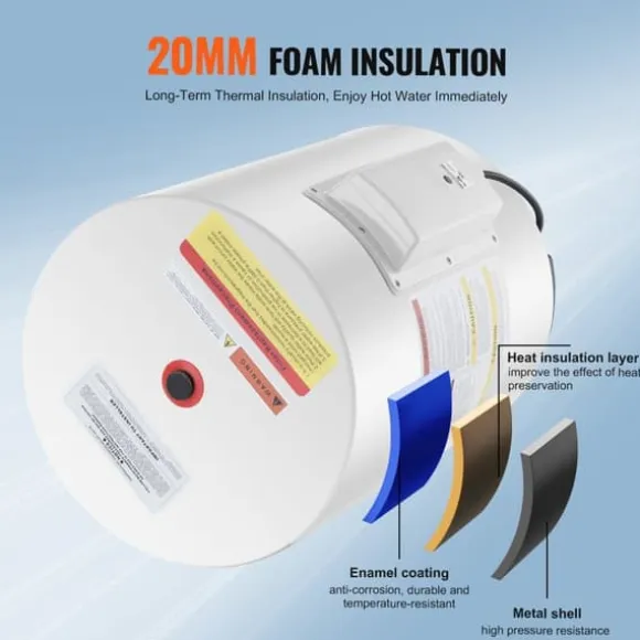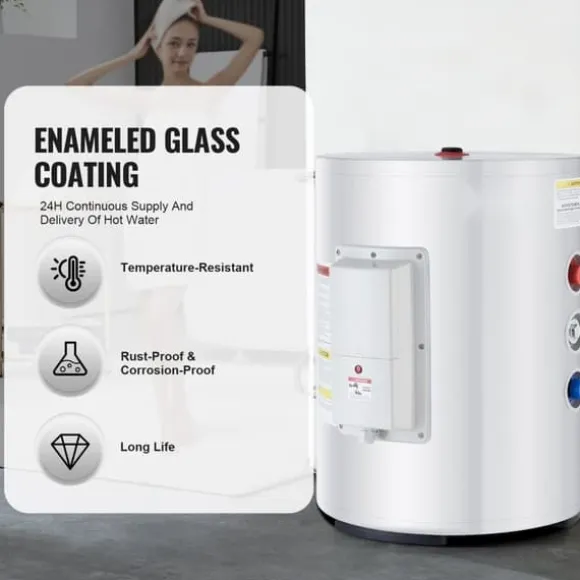 - Lagringskapacitet på 10 gallon: Denna värmare har en lagringskapacitet på 10 gallon/40L för att tillgodose familjens behov av varmvatten, inklusive diskning och tvätt. Med en effekt på 1600W minimeras väntetiden för varmvatten vid kranen.