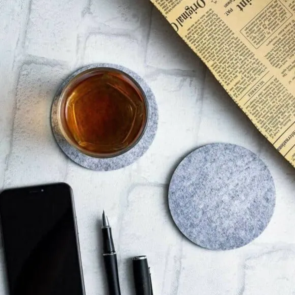 Vare sig du använder dem i vardagsrummet, köket eller på kontoret, kommer dessa glasunderlägg att vara ett praktiskt och stilfullt tillägg till ditt hem. Ge dina gäster ett varmt välkomnande och njut av att ha ett rent och snyggt hem med dessa vändbara glasunderlägg i grå filt.