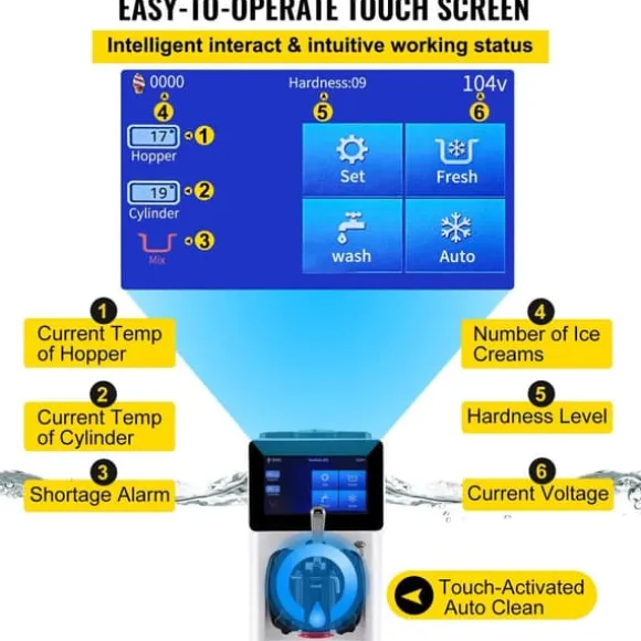 -Smart pekskärmskontroll: Vår mjukglassmaskin har en extra stor pekskärm. Skärmen visar den aktuella temperaturen för behållaren och cylindern så att du kan göra snabba justeringar när det behövs. Kvantitet, hårdhetsgrad och spänning visas också direkt. Bristlarmfunktionen påminner dig om att lägga till fler ingredienser i blandningsbehållaren. Dessutom kan den självrengörande funktionen aktiveras med bara en knapptryckning.