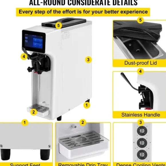 -Tänksamma produktdetaljer: Vår mjukglassmaskin har en användarvänlig design för att förbättra din användarupplevelse. Dammskyddet håller effektivt blandningen ren och hygienisk. Handtaget i rostfritt stål är ergonomiskt utformat för att enkelt pressa ut glass. Gott om kylventiler på baksidan hjälper till att avleda värme snabbt och förhindra överhettningsskador. Droppbrickan är avtagbar för regelbunden rengöring, och 4 gummifötter förbättrar maskinens stabilitet.