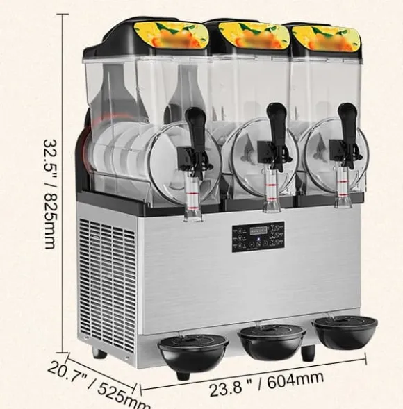 Denna 3x12L frysta dryckesmaskin erbjuder ett attraktivt sätt att servera dina gäster deras färska favoritjuicer. Hållbar konstruktion är ett stort plus för alla utrymmen, cateringevenemang eller bankett. Den har en högkvalitativ kompressor och solid kopparkondensor för snabb kylning och tyst drift.