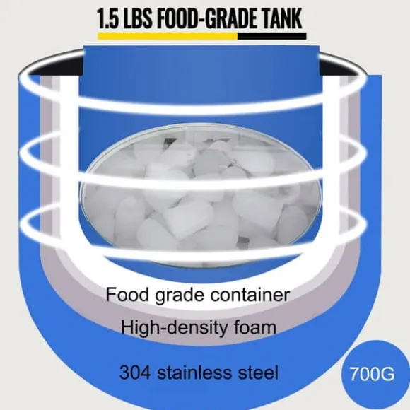 Tankdesign i tre lager. Livsmedelsgodkänd behållare rymmer upp till 1,5 lbs (700 g) isbitar (ungefär 70). Högdensitetsskum hjälper till att hålla temperaturen och isolera. Högkvalitativt ABS-skal, starkt och hållbart.
