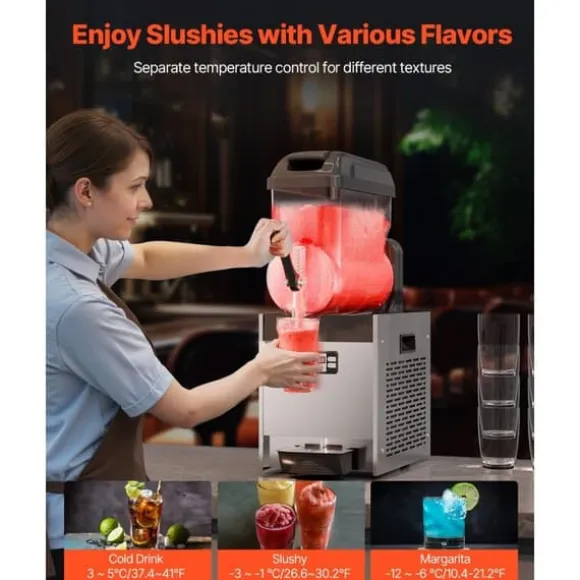 För olika drycker: Denna uppgraderade kommersiella slushmaskin har ett justerbart temperaturområde på 5 ~ 59 ℉ / -15 ~ 15 ℃, vilket ger dig möjlighet att kontrollera mjukheten eller hårdheten på dina drycker. För kalla drycker: 3 ~ 5 ℃ / 37,4 ~ 41 ℉; för alkoholfria slushies: -3 ~ -1 ℃ / 26,6 ~ 30,2 ℉; för alkoholhaltiga drycker: -12 ~ -6 ℃ / 10,4 ~ 21,2 ℉. (Rekommenderad sockerhalt: cirka 13 %, alkoholhalt: under 13 %). Den är idealisk för att skapa ett brett utbud av drycker som juice, te, margarita och iskaffe.