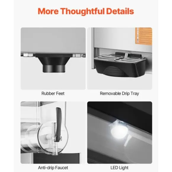 Ytterligare funktioner: Slushmaskinen är utrustad med en droppbricka i botten för att förhindra vattenläckage och den fjäderbelastade kranen säkerställer minimalt vattenläckage efter användning. Den tresidiga ventilationsdesignen bidrar till snabb värmeavledning och gummifötterna ger halkfri stabilitet under drift för bättre maskinstabilitet.