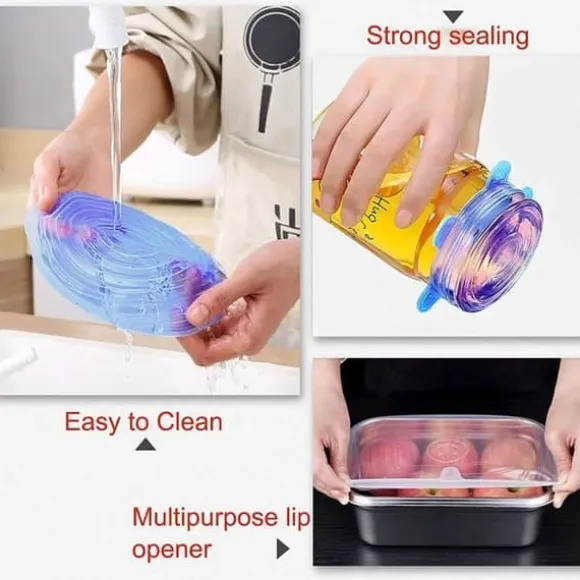 Livsmedelskvalitet: Silikonlocken för livsmedel och skålar använder ett högkvalitativt silikont material och har tjockare kanter för maximal tätning. Dessa är tillräckligt släta, slitstarka och elastiska för att anpassa sig till behållare av olika former för att förhindra spill samtidigt som de håller livsmedlen fräscha.