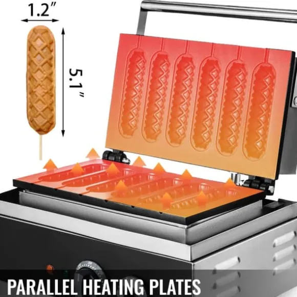 Corn Dog Waffle Maker är utrustad med parallella värmeplattor av gjuten aluminium. Nonstick-belagd yta förhindrar att våfflor bränns. Enstaka våfflor mäter 5,1″ x 1,2″ (130 x 30 mm).