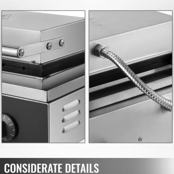-Tungt material: Denna kommersiella korvvåffelbryggare är gjord av högkvalitativt matkvalitetsmaterial av rostfritt stål och högkvalitativ gjuten aluminiumplatta, hygienisk, hållbar och lätt att rengöra.