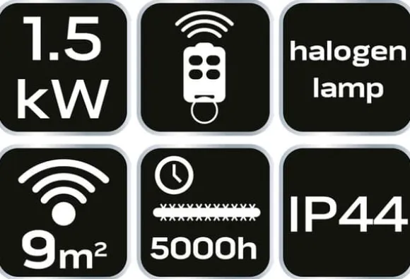 Infrarödvärmaren 90-034 är en apparat som omvandlar elektrisk energi till värme. De utsända strålarna skapar en behaglig och hälsosam värme, ungefär som att vara i solen. Värmaren når sin fulla värmeeffekt omedelbart efter att den slagits på. Den kan användas både utomhus och inomhus. Tekniska specifikationer: effekt: 1500W, värmeelement: halogenlampa, kapslingsklass: IP44, värmeyta: 9 kvm, brinntid: 5000 timmar, extra utrustning: fjärrkontroll. Monteringsalternativ: vägg, tak, stativ.