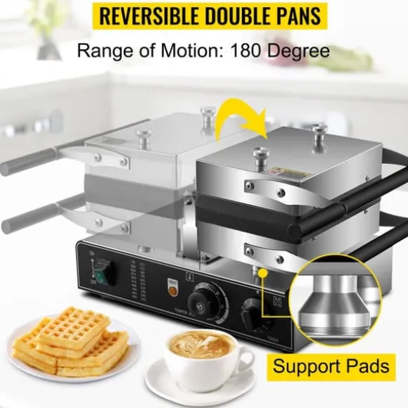 -Vändbar dubbelsidig bakning: Denna kommersiella våffelbryggare använder 1600W hög effekt och är utrustad med parallella värmeplattor, som värms upp snabbt och jämnt under gräddningen. Den kan producera två stycken rektangulära våfflor (ungefär 6,7″x4,0″x1,1″) åt gången, vilket minskar gräddningstiden och ger dig behagliga och läckra snacks inom 5 minuter. Det rekommenderas att vända plåten när den dubbla maskinen håller på att lagas Placera på en tallrik för jämn färg och perfekt form på våfflorna.