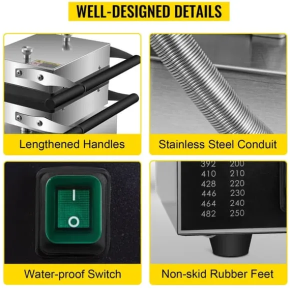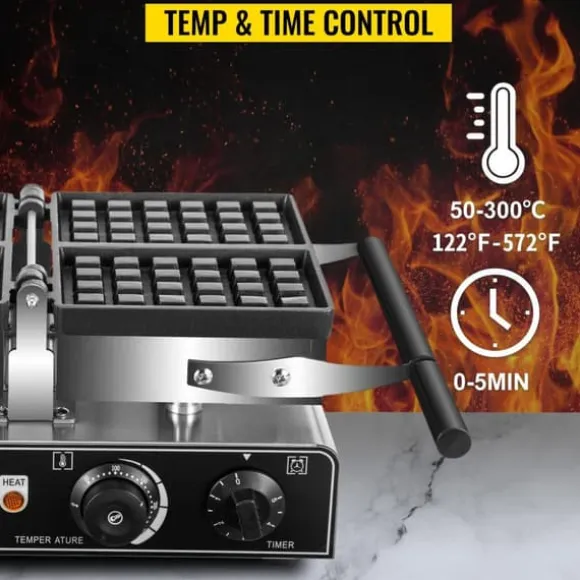 – Exakt kontroll av temperatur och tid: Med två vred på basen kan du enkelt styra uppvärmningstemperaturen och gräddningstiden. Temperaturintervallet är från 122°F/50°C till 572°F/300°C, och timern kan ställas in på 5 minuter. Indikatorlampan visar våffelmaskinens arbetsstatus. När temperaturen når 482°F/250°C blir den röd för att indikera att enheten värms upp. När den inställda tiden är ute kommer den att påminna dig med ett tydligt och behagligt larm.