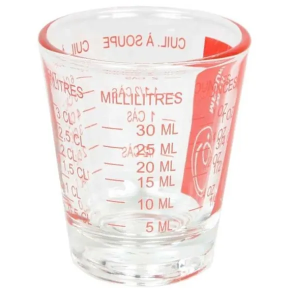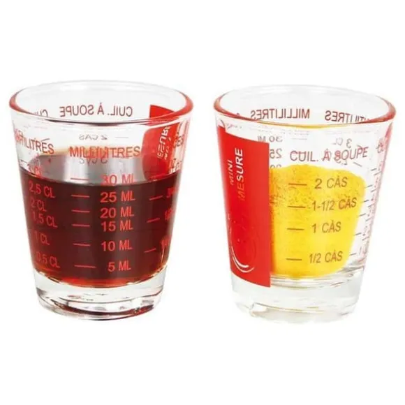 2 mini måttbägare. Denna lilla måttkopp mäter dina ingredienser från 5 till 35 ml. Gradering i milliliter, uns, matskedar, teskedar. Material: glas. Kan även användas som skytt!