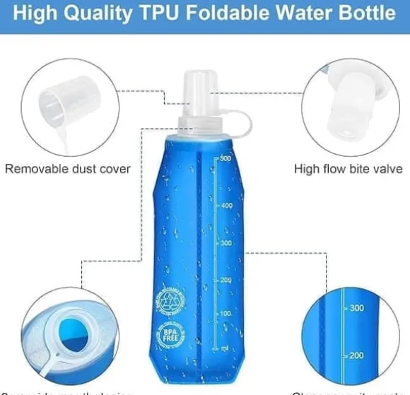 Den här TPU-hopfällbara vattenflaskan är lätt, hopfällbar, återvinningsbar och portabel. Den är perfekt för att hålla dig hydrerad under olika sportaktiviteter. Den mjuka flaskan är ett måste för löpning, trailrunning, vandring, cykling, jogging, klättring eller resor, och passar de flesta löparbälten och höftväskor.