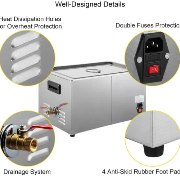 -Användarvänlig design: Denna ultraljudsrengörare för skrivbordet är speciellt designad för bättre kundanvändning: bärbart handtag, dräneringsanslutning, värmeavledning, halkfria gummifötter, lock och LED-skärm för att visa tid och temperatur i realtid.