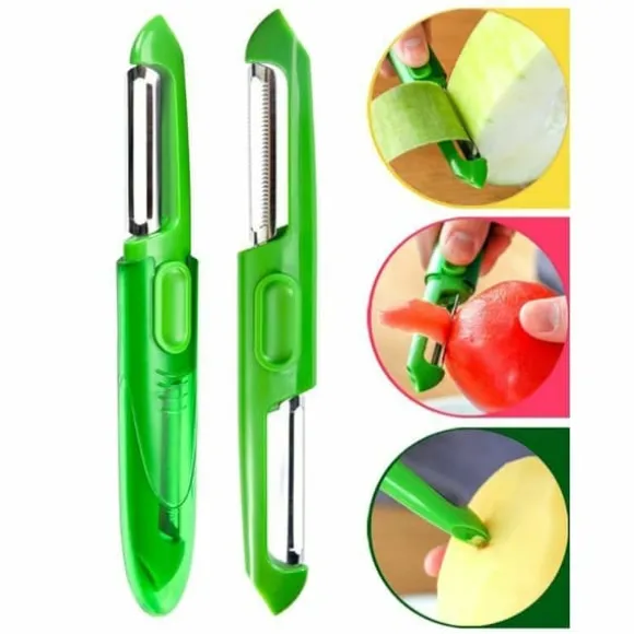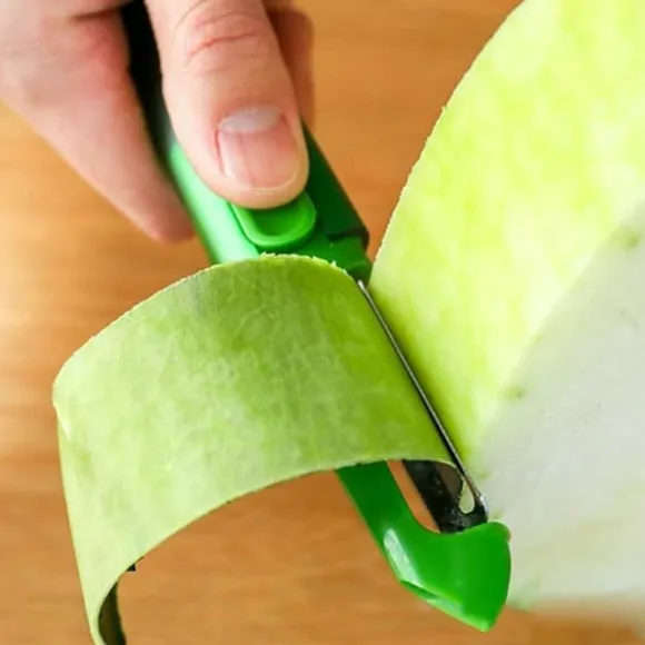 En vanlig skalare har svårt att få grepp på frukter och grönsaker som är lite halare. Det klarar den sågtandade delen på denna 3-i-1 skalaren av utan problem. Den sågtandade delen är perfekt för att skala exempelvis plommon, tomater och zucchini med, medan den vanliga delen fixar resten. Byt bara enkelt sida på handtaget för att använda andra delen. På änden av båda sidor av skalaren finns ett verktyg som du kan använda för att gröpa bitar ur frukt.