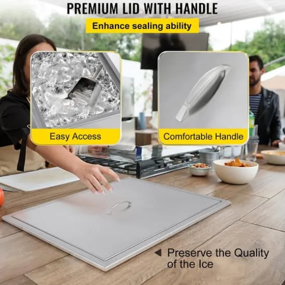 – Robust konstruktion: Denna Drop-in islåda är gjord av borstat 304 rostfritt stålmaterial för långvarig hållbarhet. Och den är dubbelväggig design för bättre värmeisoleringsarbete. Interiören har skumgummiisolering med hög densitet som håller en inre temperatur mellan 23°F till 194°F, vilket säkerställer att dina isbitar håller sig svala längre.