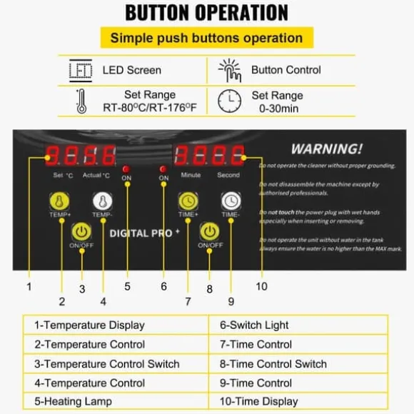 Instelbare tijd/temperatuur: De duidelijke LED-display en drukknoppen maken het eenvoudig om de werktijd en verwarmingstemperatuur in te stellen. Met een bereik van 0-30 minuten en 0-80°C kan de reiniger worden aangepast aan verschillende reinigingsbehoeften.