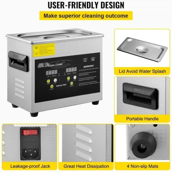 Gebruiksvriendelijk ontwerp: Het handige draagbare handvat, warmteafvoer, antislip rubberen voetjes en roestvrijstalen deksel maken deze ultrasone reiniger zeer gebruiksvriendelijk. Een doordacht ontwerp voor gemakkelijk en effectief reinigen.