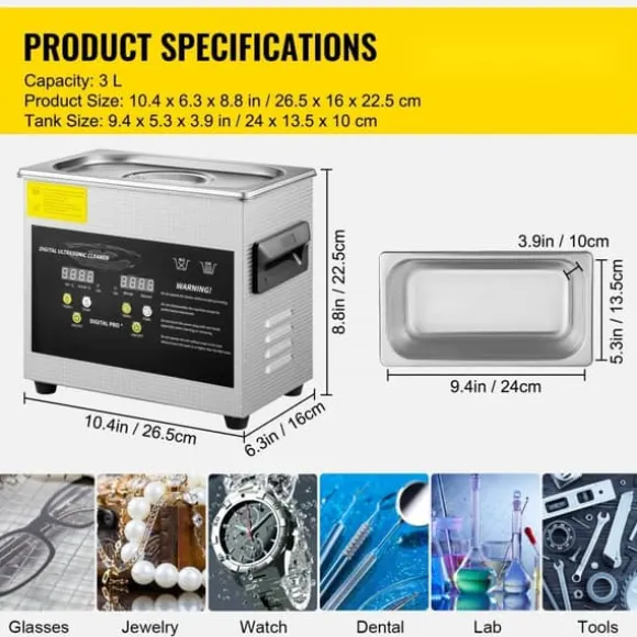 Premium kwaliteit: Vervaardigd van corrosie- en roestbestendig 304 roestvrij staal, garandeert deze ultrasone reiniger duurzaamheid en effectiviteit. Met een tankinhoud van 3 liter, een verwarmingsvermogen van 200 W en ultrasoon vermogen van 120 W biedt deze reiniger hoogwaardige prestaties voor een glanzend resultaat. Geen waterlekkage dankzij de geïntegreerde constructie.