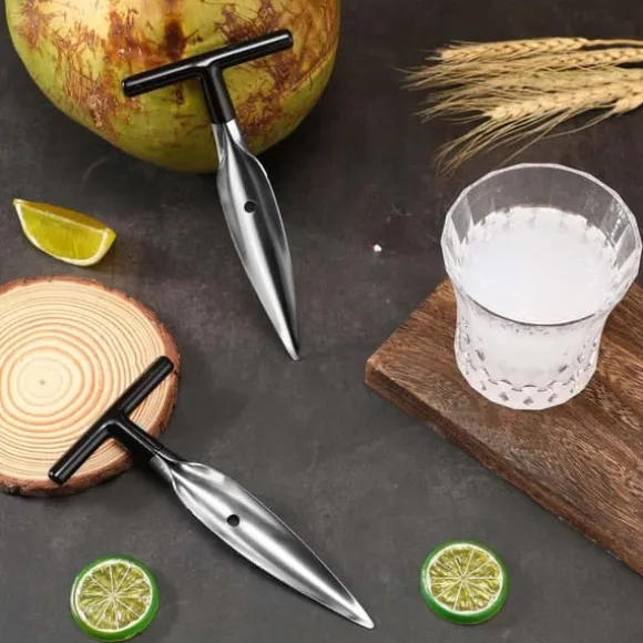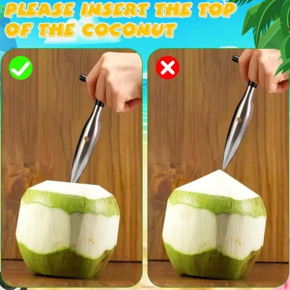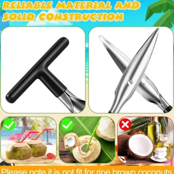 Pålitliga material och robust konstruktion: Våra kokosöppnare är tillverkade av robust rostfritt stål med ett halkfritt plasthandtag för att säkerställa hållbarhet. Varje öppnare har en glänsande silverfärg och är perfekt dimensionerad för att sticka hål i mjuka gröna kokosnötter. Detta verktyg garanterar en felfri och snabb öppningsupplevelse. Observera att det inte är lämpligt för mogna, bruna kokosnötter.
