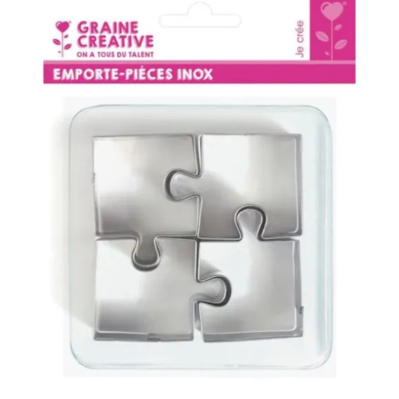 4 kakformer för bakverk eller polymerlera Dessa kakformer i rostfritt stål representerar en kvadrat som är delad i 4 pusselbitar. Självklart är dessa kakformer av livsmedelskvalitet och kan användas för att skära ut kakor, pepparkakor att baka, mandelmassa och även polymerlera. Dimensioner på pusselbitarna: 3,5 x 3,5 cm.