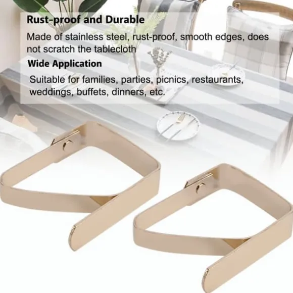 Välkommen till vår butik! Våra dukklämmor i rostfritt stål är utformade för att hålla dina bordsdukar säkert på plats och förhindra att de glider även i blåsiga förhållanden. Varje klämma mäter cirka 5 cm x 4 cm och är tillverkad av rostfritt, hållbart rostfritt stål med släta kanter för att undvika att repa din duk. Setet innehåller 4 guldfärgade klämmor, lämpliga för bord med en tjocklek på mindre än 3 cm. Dessa klämmor är enkla att installera och ta bort, vilket gör dem idealiska för en mängd olika användningsområden som familjesammankomster, fester, picknickar, restauranger, bröllop, bufféer och middagar. De är en pålitlig hjälpreda för både inomhus- och utomhusaktiviteter och erbjuder upprepad användning jämfört med plastalternativ. Nöjdhet: Våra kunder är vår högsta prioritet. Om du upptäcker några produktproblem efter att du mottagit varorna, såsom skador eller felaktig mängd varor, vänligen kontakta säljaren omedelbart. Vi gör vårt bästa för att ge dig tillfredsställande kundservice.