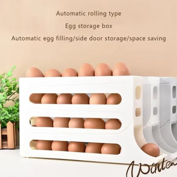 Automatisk äggdispenser – En platsbesparande, robust ägghållare med en gravitationsbaserad rullande design, som rymmer upp till 30 ägg och säkerställer säker, organiserad förvaring i ditt kylskåp eller kök.