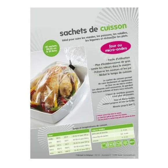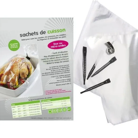 Med tillagningspåsar återupptäck en smakrik matlagning utan att behöva tillsätta fett! Kryddorna och aromerna infunderas i påsen och doftar upp ditt kött, din fisk eller grönsaker! De kan användas i ugn och mikrovågsugn. De förhindrar stänk! 2 kit med 20 påsar och 20 snören. I PET 19 mikron. Dimensioner: 38 x 25 cm.