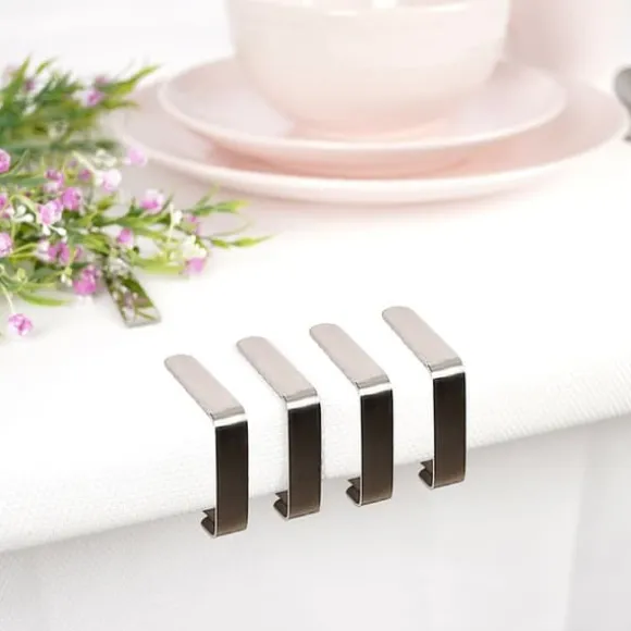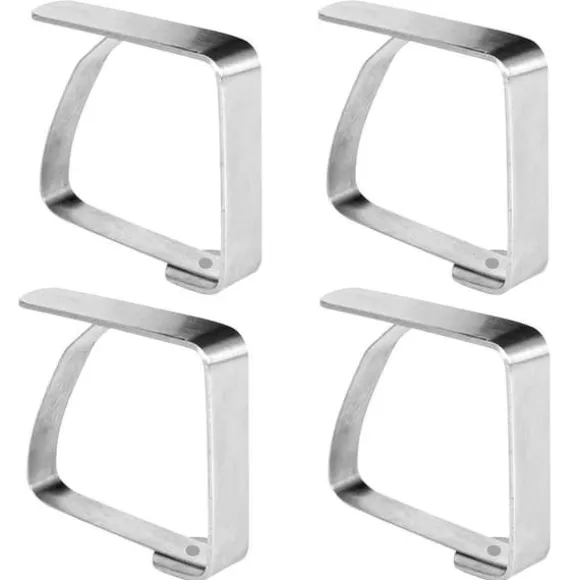 En uppsättning med fyra stålduksklämmor. De hjälper till att hålla ditt bord organiserat och estetiskt tilltalande. De är användbara i alla hem, trädgårdar, terrasser eller balkonger. Oumbärlig under blåsigt väder under utomhusfester eller picknick. Klämmor förhindrar att materialet förskjuts och skrynklas.