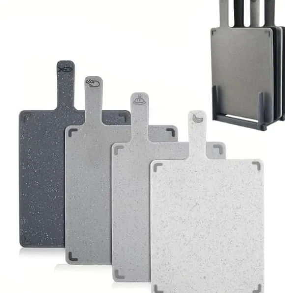 Det medföljande stället gör det enkelt att förvara skärbrädorna stående, antingen i ett hörn på bänken eller under skåpet – utan att ta upp onödig plats.
