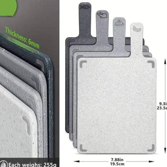 Varje skärbräda mäter 19.5 x 23.5 cm (7.88 x 9.3 tum), en bekväm och rymlig yta som passar utmärkt för alla typer av matförberedelser – från hackning till uppläggning.