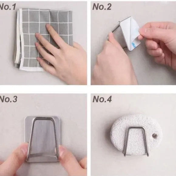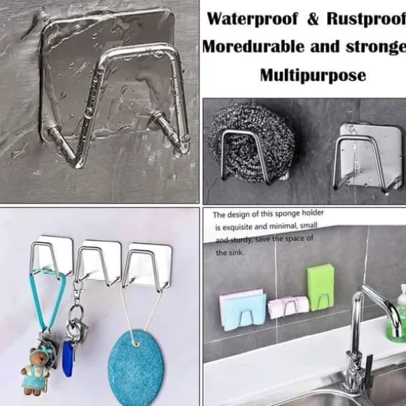 5 st kökssvamphållare, självhäftande svamphållare, storlek: 4,8*4,8*3,6cm; Vikt: 44g/styck; Material: 304 rostfritt stål + viskos; Vatten- och rostbeständig, den kommer inte i kontakt med vatten