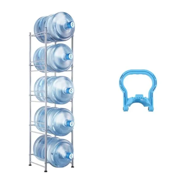 Vår vattenkannahållare har höga skyddsräcken för att förhindra att högre hinkar faller och hyllspår för att hålla flaskorna säkert på plats. De fyra justerbara fötterna skyddar golv från repor och säkerställer stabilitet på ojämna ytor. En tippskyddsfunktion gör att ställningen kan monteras på väggen för extra stabilitet. Handtag gör det enklare och bekvämare att lyfta och placera flaskor.