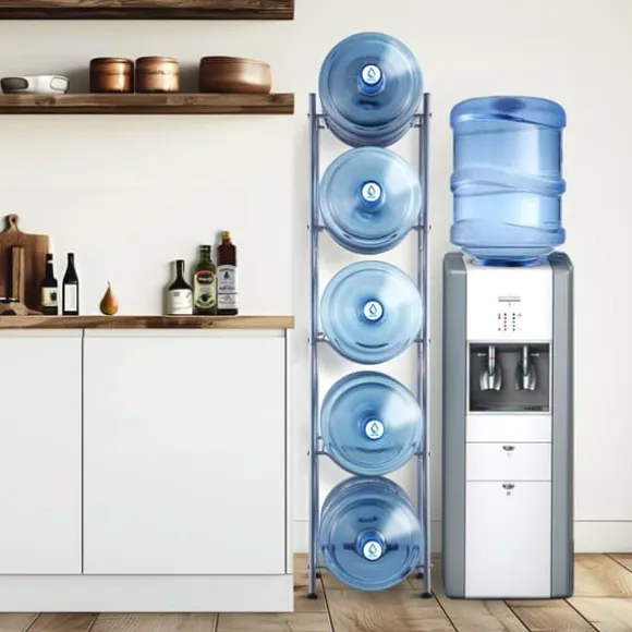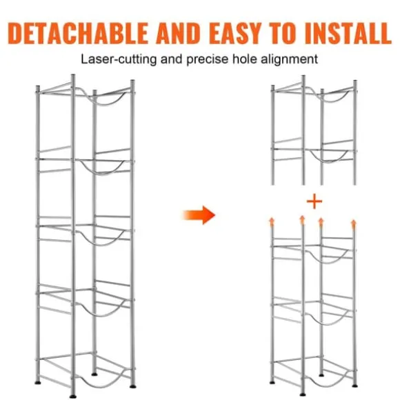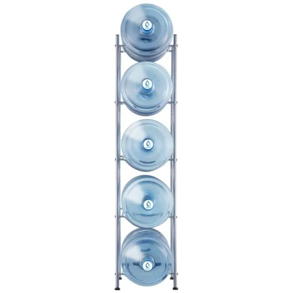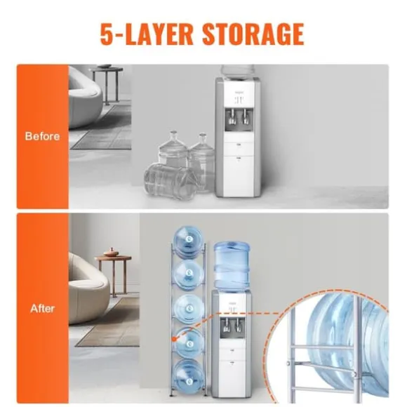 Denna 5-lagers vattenkannahållare mäter 13 x 13 x 53,3 tum. Dess vertikala design rymmer upp till 5 flaskor och stöder upp till 209,4 lbs. Det sparar utrymme genom att stapla flaskor snyggt i ett hörn. Dess enkla industriella design kompletterar olika inredningsstilar, vilket gör den idealisk för alla utrymmen!
